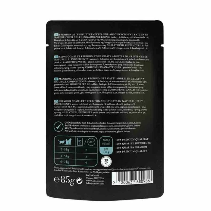 Le bustine fresche CAT’S LOVE Salmone sono realizzate con olio di cartamo e prezzemolo. Queste bustine fresche 100% naturali sono prive di cereali e forniscono un pasto completo per il tuo gatto.