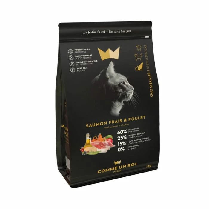 Le crocchette per gatto sterilizzato senza cereali Comme Un Roi al salmone e pollo sono il pasto perfetto per il tuo gatto. Questa alimentazione completa, sana ed equilibrata sarà molto apprezzata dal tuo pelosetto grazie al suo buon sapore di carne fresca.