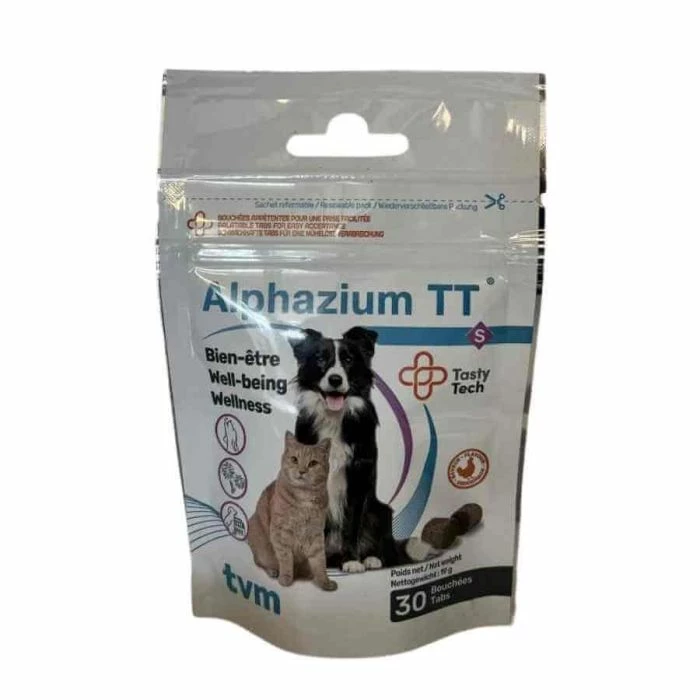 Alphazium TT è un integratore alimentare sotto forma di bocconcino appetibile per cani e gatti stressati, timorosi o agitati. Alphazium TT può essere somministrato prima di una situazione di stress: viaggio in auto, visita dal veterinario… Per rassicurare e calmare il tuo animale.